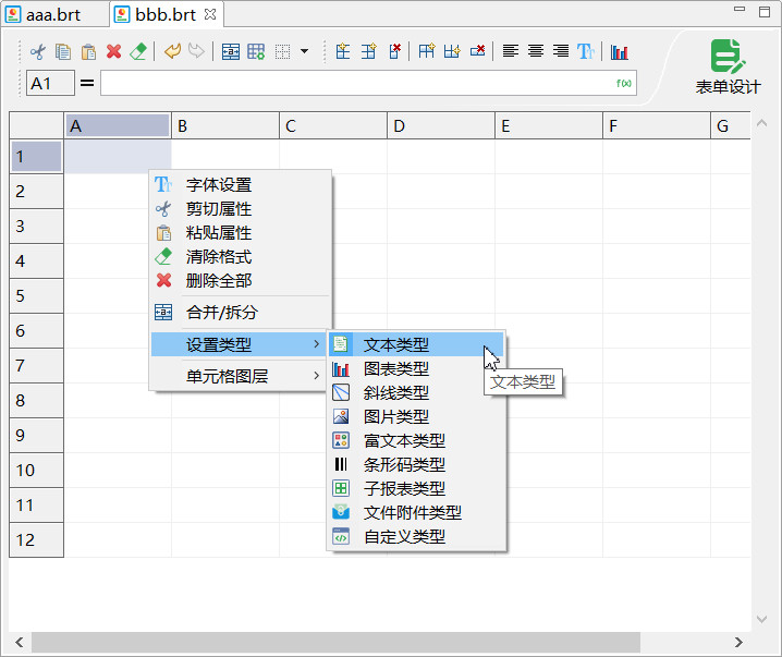 单元格的类型:单元格按照不同的用途,可以分成数据单元格(文本类型单元格)、图表单元格、斜线单元格、图片单元格、条形码单元格等。