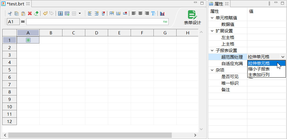 超范围处理:拉伸单元格,缩小子报表,主表加行列